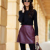 The Jackie skirt is made of a leather-like material, which is perfect for the autumn-winter season. The skirt was made in a trapeze shape, which looks good on any figure. The reinforced waist belt beautifully emphasizes the waist, and the mini length exposes the legs. An elastic band has been sewn into the back, which ensures a perfect fit and guarantees comfort. An additional asset of the skirt are pockets located on the sides. The skirt has a sewn-in lining. Jackie skirt will look great in autumn-winter styling with a voluminous oversize sweater and massive lace-up trappers, as well as in a more elegant look, combined with a shirt and boots on a pole. A large bag and a warm scarf will be a stylish complement to the whole look. The leather skirt is an excellent option for various occasions, from everyday meetings to elegant outings. The product is manufactured and sewn in Poland.