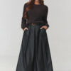 Stylish black faux leather skirt is an absolute must-have in a woman’s wardrobe! Made of soft, pleasant to the touch material imitating leather, it looks elegant and modern. The skirt has a flared midi cut, which beautifully flows with movement and emphasizes the silhouette. The set includes a trendy belt with a buckle that accentuates the waist and adds character to the whole look. It is a perfect choice for both everyday wear and special occasions, looks great with a fitted turtleneck, shirt or oversized sweater. Thanks to its versatility, it goes well with ankle boots, knee-high boots or classic pumps. Produced in Italy.