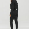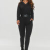 This jumpsuit is an elegant and modern proposal in classic black. Made of soft, slightly elastic material, it ensures comfort while emphasizing the silhouette. It has long sleeves and tapered legs, making it suitable for various occasions, both casual and more formal. The V-neckline is adorned with a subtle faux leather insert, giving the jumpsuit a modern, sophisticated character. At the waist, there is a wide belt made of eco-leather, which further accentuates the figure, giving the whole outfit a sleek shape. The jumpsuit also features pockets, increasing its functionality and adding a casual style. At the back, there is a concealed zipper that allows for easy wearing of the jumpsuit. The outfit is paired with black suede heeled ankle boots, adding elegance and making the look cohesive and harmonious. Overall, it is the perfect choice for evening outings, social gatherings, or less formal events where elegance meets comfort.