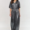 This jumpsuit is a combination of elegance and comfort, which will surely attract attention at any special occasion. The loose top with kimono-style sleeves adds lightness and freedom to it. This detail makes the outfit look exceptional and stylish, while not restricting movement. The V-neck is subtle and elegant, perfectly showcasing the neck and shoulders. This neckline adds sensuality and emphasizes the feminine silhouette, maintaining a classic, sophisticated look. The wide-leg pants give the jumpsuit lightness while masking figure imperfections and allowing to elongate the silhouette. The elastic waistband ensures a perfect fit and emphasizes the figure, creating a waist-cinching effect. Thanks to this, the jumpsuit not only looks stylish, but also comfortable throughout the day or evening. The model is made of delicate material with a metallic finish, giving the outfit a unique shine and a modern character. A metallic jumpsuit with a V-neck is a proposal that will make you stand out from the crowd. Its modern cut and shiny material will make you feel confident and stylish at any event. It is a perfect alternative to a dress, guaranteeing comfort and a unique look.