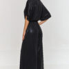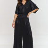 This jumpsuit is a combination of elegance and comfort, which will surely attract attention at any special occasion. The loose top with kimono sleeves adds lightness and freedom to it. This detail makes the outfit look exceptional and stylish, while not restricting movement. The V-neck is subtle and elegant, perfectly highlighting the neck and shoulders. This neckline cut adds sensuality and emphasizes the feminine silhouette, maintaining a classic, sophisticated look. The wide-leg pants give the jumpsuit lightness while masking figure imperfections and allowing to elongate the silhouette. The elastic waistband guarantees a perfect fit and emphasizes the figure, creating a waist-cinching effect. Thanks to this, the jumpsuit not only looks stylish but also comfortable all day or night. The model is made of delicate material with a metallic finish, giving the outfit a unique shine and modern character. A metallic jumpsuit with a V-neck is a proposal that will make you stand out from the crowd. Its modern cut and shiny material will make you feel confident and stylish at any party. It is an excellent alternative to a dress, ensuring comfort and a unique appearance.