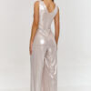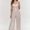 We present an elegant jumpsuit made of metallic material, thanks to which we gain a spectacular and modern look. The deep V-neckline exposes the shoulders and neck, adding sensuality and elegance to the styling, while the thin straps give the whole outfit a universal appeal. The top is fitted, cut at the waist with a wide belt, which perfectly emphasizes the silhouette, creating the effect of a slimmer figure. The wide, straight trousers give it lightness and class, making it a modern choice that attracts attention and allows you to feel stylish and confident. Additionally, there is a delicate cutout exposing the back, finished with a zipper for easy dressing. Our metallic jumpsuit is a perfect choice for evening outings, special occasions, and stylish banquets. Thanks to its modern design, it will provide you not only with comfort throughout the evening but also with a dazzling look that will attract all eyes. Pair it with elegant heels and jewelry to create a unique styling.