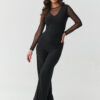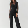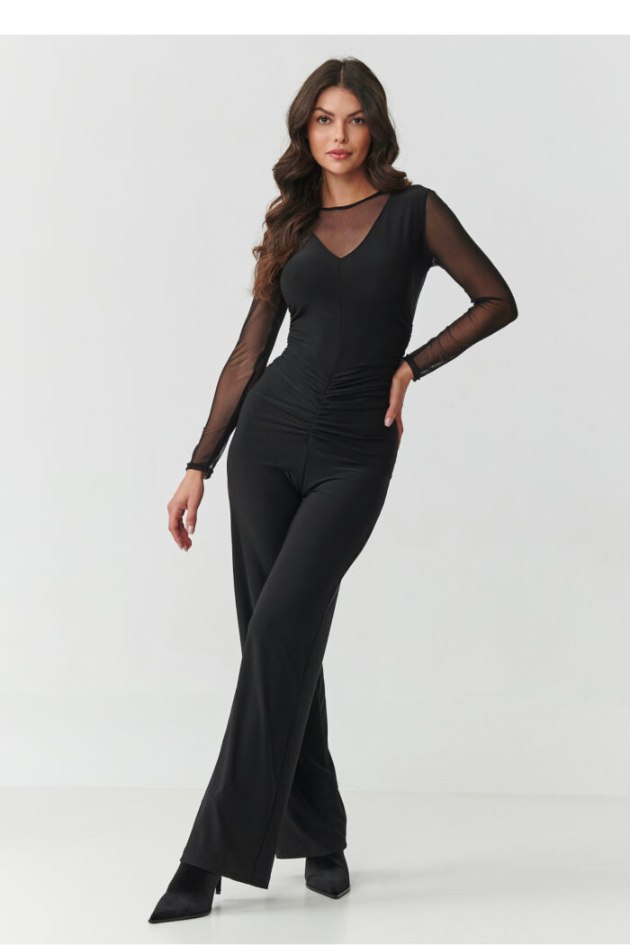 This unique black jumpsuit for women is the quintessence of modern elegance. Designed for women who value comfort but do not want to give up style and class, it will be perfect for an evening out, cocktail party, or elegant dinner. The top of the jumpsuit delights with subtle tulle inserts, long, semi-transparent sleeves, and a V-neckline shape that adds lightness and sensuality to the whole, while remaining elegant and stylish. The fitted waist beautifully accentuates the silhouette, and the wide, straight legs add character to the whole and visually lengthen the legs. Fastened with a zipper at the back, the jumpsuit ensures comfort and perfect fit to the figure. This is the perfect choice for women who want to stand out in the crowd by choosing a stylish alternative to evening dresses. Tulle: 100% polyester.