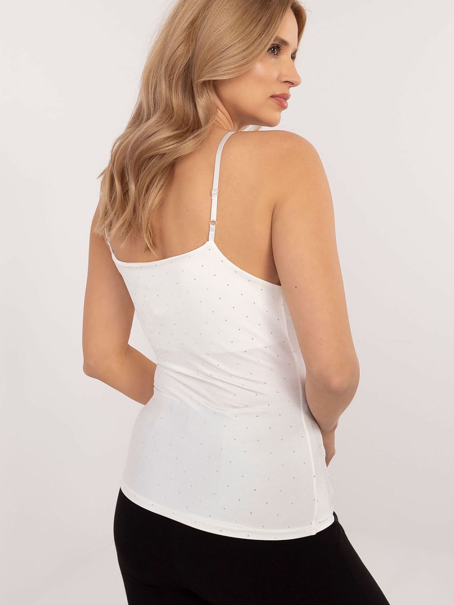 Elegant top with adjustable straps that catches the eye thanks to subtle rhinestones all over the fabric. Made from a high-quality combination of polyester and viscose, it ensures comfortable wear and durability. The standard length and round neckline give it a versatile character, which will work both for everyday styling and for more elegant occasions. The top blends perfectly with other items of clothing, and its shiny rhinestone texture brings a touch of sophisticated glamour to the look.