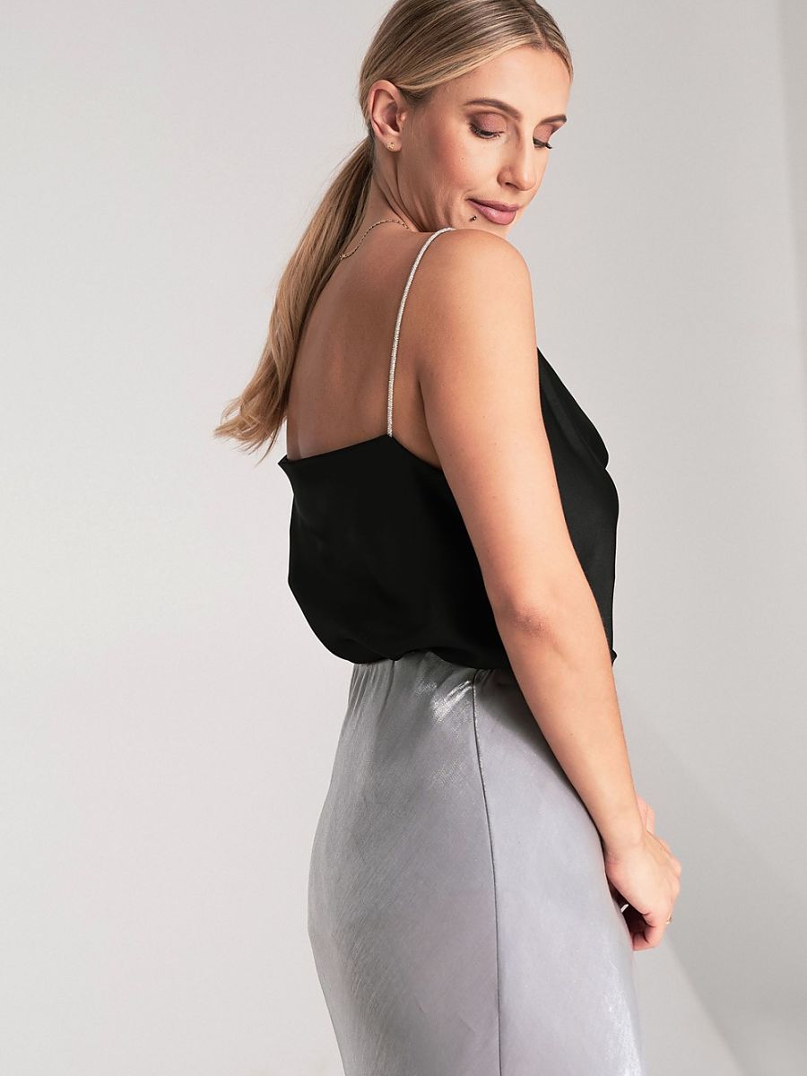 Satin top with shiny, crystal straps. Flowing water neckline.