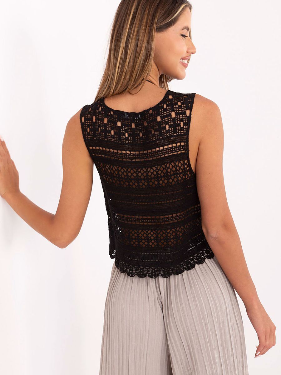 Top in boho style is a perfect choice for lovers of trendy and lightweight stylizations. Made of dominant material, cotton with added elastane, it provides comfort and subtle fitting to the silhouette. The characteristic, varied texture of the material and intricately made lace details give it a unique, ethereal look. The round neckline and sleeveless design make this model perfect for summer outfits with both jeans and a flowing skirt. The standard length of the top allows for easy styling, and the boho vibe adds a casual charm. Perfect for walks, festivals or outdoor meetings during holidays.
