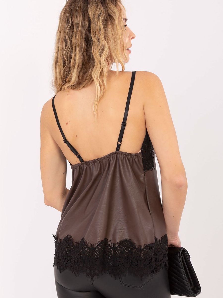 Stylish women’s top made of eco leather is a fashionable proposal perfect for everyday and casual stylizations. Made of a combination of polyester and polyurethane, it impresses with a smooth finish and a modern look, while remaining comfortable to wear. The model has a standard length and straps with the possibility of adjustment, making it easy to fit to the silhouette. The V-neck subtly emphasizes the bust line, and the delicate lace at the neckline and the bottom of the top adds a feminine, romantic character to it. The top is lightly insulated and will work great in many everyday outfits, both with jeans and under a blazer or cardigan. It is a fashionable wardrobe piece that will complement any outfit.