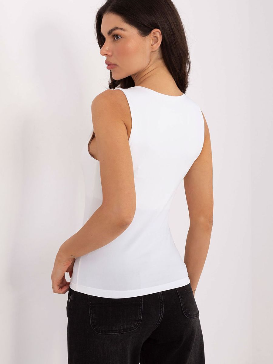 The basic casual style t-shirt is a universal element of the wardrobe, perfect for everyday wear and layering styling. Made of a flexible blend of polyamide and elastane, it lays nicely on the body, providing comfort and freedom of movement. The model of standard length and sleeveless will work great on warmer days or as a base under shirts, sweatshirts, or cardigans. The smooth pattern gives a minimalist, timeless character. The whole is complemented by a round neckline, which emphasizes the simple, classic style of the t-shirt. A must-have in every wardrobe.