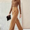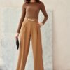 Wide women’s pants with decorative chain, are made of great quality fabric that will breathe and provide comfortable wearing. The pants have wide bell cut legs. They are also characterized by a high rise, which will slenderize the figure, and a decorative chain imitating a belt. They are fastened at the back with a zipper. The product is made and sewn in Poland.
