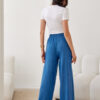 Women’s trousers with long legs. Tied top high waist and long, wide legs. Trousers have side, open pockets and an elastic waistband.