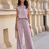 Women’s trousers with long legs. Tied top high waist and long, wide legs. Trousers have side, open pockets and an elastic waistband.