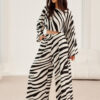 Long Livia pants with wide wide-legs are a perfect choice for summer days, combining comfort and trendy design. Their loose fit provides freedom of movement and comfort throughout the day. Pants in an eye-catching animal print are a standout element of any outfit. Made of a lightweight blend of viscose and linen, they are breathable and pleasant to the touch, and the comfortable waistband guarantees a perfect fit and comfort, even on hot days.