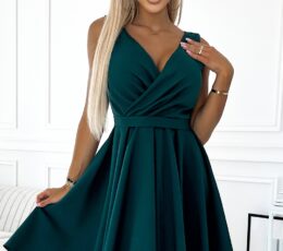 Asymmetrical dress with a longer back, neckline and belt. The dress comes in a bottle green color. The skirt with a longer back will be perfect for dancing. Polish production. Attitude is a Choice brand.
