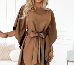 Minimalism that makes an impression. This butterfly-style dress by Attitude is a Choice combines a loose, flowing line with a waist belt, allowing you to shape perfect proportions in seconds, from everyday elegance to evening outings. The soft, pleasant to the touch fabric beautifully flows with movement, and the asymmetrical wings/poncho subtly mask the shoulder and waist areas. The simple round neckline and knee-length create a modern, timeless look. Made in Poland, the quality of the Attitude is a Choice brand. Opt for timeless simplicity and comfort. Choose a Attitude is a Choice dress and enjoy Polish quality that looks great in any situation. The elegant butterfly dress with a belt and bow by Attitude is a Choice is a combination of comfort and feminine style. Made in Poland from soft, pleasant material, it subtly flows around the silhouette and accentuates the waist. Perfect for everyday wear, work, or elegant meetings.