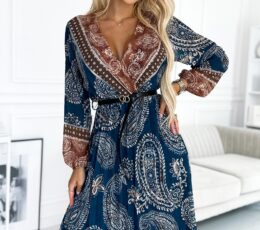 Chiffon pleated midi dress with neckline, long sleeves and black belt. Pattern: blue with brown. Brand Attitude is a Choice basic. European production.
