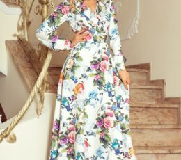 A long ethereal dress with a neckline, a frill and long sleeves. Made of pleasant to the touch fabric with colorful roses and blue birds. The Attitude is a Choice brand. Made in Poland.