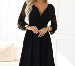 This elegant black midi dress from the Attitude is a Choice brand is a model created for women who appreciate timeless style and perfect fit. The wrap neckline beautifully accentuates the bust line, while the slightly flared bottom adds lightness and natural elegance to the silhouette. Transparent tulle sleeves give the whole a refined character, delicately balancing between classic and modern. The dress is perfect for weddings, communions, baptisms, dinners, dates, family celebrations, New Year’s Eve or a business outing. It is the perfect choice if you want to look elegant, feminine and feel comfortable all day long. Add it to your cart and create a styling in which you will feel more confident. Made in Poland.