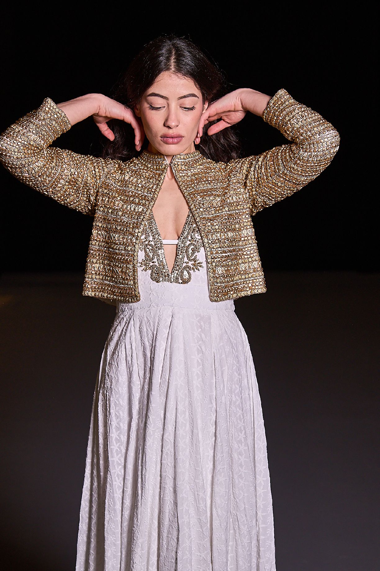 This couture jacket is meticulously crafted with intricate crystal embellishments, metallic embroidery and refined textured detailing that create a luminous, sophisticated finish. The structured silhouette enhances elegance while offering a modern couture aesthetic.