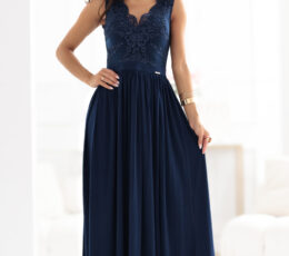 LEA is a unique evening dress by Attitude is a Choice that combines elegance and modern style. The top of the creation is made of beautiful guipure lace with a V-neckline, subtly emphasizing the feminine silhouette. The back is adorned with transparent lace, and the flowing, flared bottom with a high slit adds lightness and a sensual character. Made in Poland from high-quality, elastic material, it ensures comfort and perfect fit. It is an ideal choice for a wedding, ball, prom, New Year’s Eve, or elegant gala. This navy blue long evening dress is a timeless creation that will work well for special occasions. Choose a lace maxi dress with a slit and feel like a star at any party.