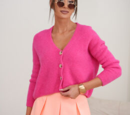 A short women’s sweater is a stylish and versatile option for any occasion. Made of soft, pleasant to the touch knitwear, it ensures comfort throughout the day. The classic cut with long sleeves and a V-neck subtly emphasizes the silhouette, adding elegance to the whole. The sweater fastened with buttons allows for various styling options, it can be worn solo or as a cardigan over a top or shirt. It pairs perfectly with both jeans and skirts, creating fashionable and feminine outfits.