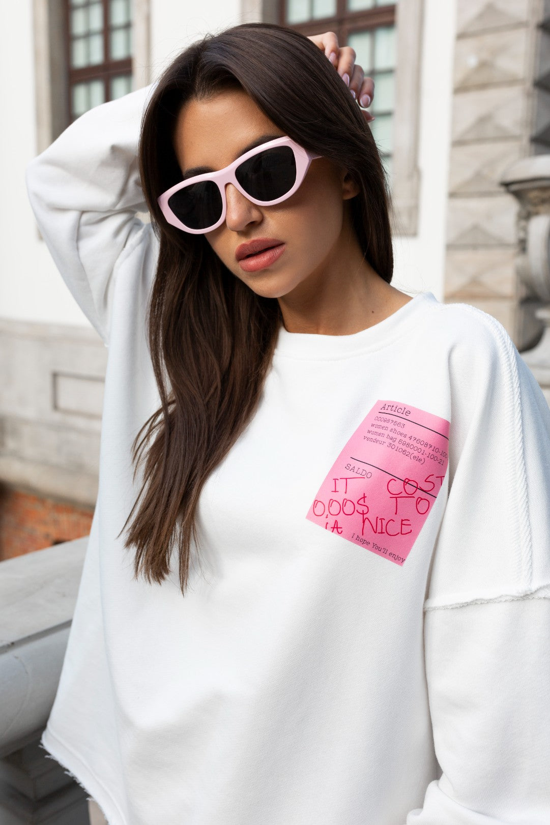 Sweatshirt – oversized with a receipt-shaped screen – White with Pink